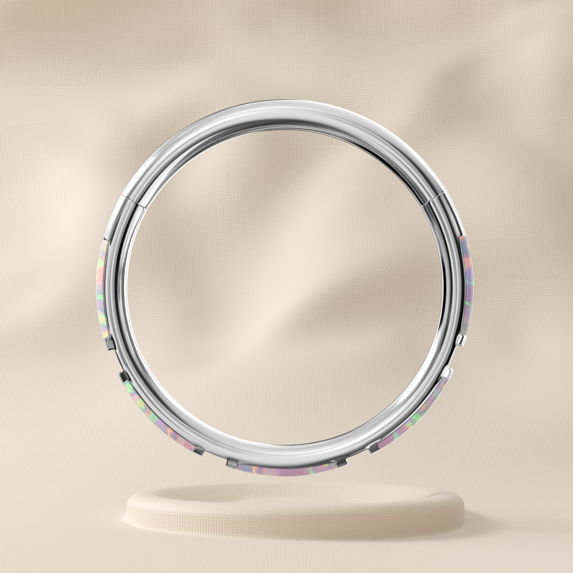 Crafted from premium 316L surgical steel, this clicker ring features radiant synthetic opal inlays that add a unique, iridescent glow. Designed with a hinged segment closure, it opens and secures smoothly for comfortable, everyday wear. Perfect for septum, daith, helix, and cartilage piercings.